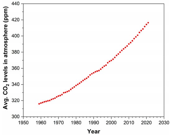 The rapidly increasing greenhouse gas concentrations in the environment, resulting in the current climate crisis, are a cause of huge concern. Over the past few decades, carbon dioxide emissions have drastically expanded due to an increase in the usage of fossil fuels and deforestation, with a world annual average environmental concentration of 418.37 ppm in 2023 [1]. Figure 1 shows that, from 1959 to 2022, the level of CO2 concentration increased severely, with a 0.5% growth rate annually [2]. Controlling the amount of CO2 in the atmosphere is a global challenge that needs to be resolved with the utmost priority. There has been increasing pressure on manufacturing industries to produce efficient methods for reducing CO2 emissions [3]. Since it is an abundant, non-toxic, non-combustible, renewable supply of carbon that is highly functional and an eco-friendly chemical reagent, carbon dioxide is a very attractive C1 building block in organic synthesis.