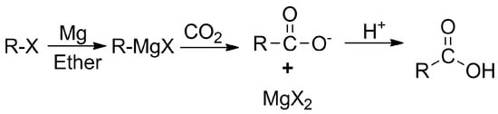 Previously, strong nucleophilic reagents such as Grignard reagents were used for carboxylation (Scheme 1), in which CO2 acted as an electrophile. However, the main drawback with Grignard reagents is that they are air-sensitive and readily react with protic solvents and acidic functional groups, such as alcohol and amines [26]. Nevertheless, there are other well-known traditional synthetic pathways based on the hydrolysis of nitriles via acids, the oxidation of primary alcohol, and the carbonylation of organic halides with dangerous and poisonous carbon monoxide that can be used to synthesize carboxylic acid. The most appealing and simple way is the catalytic CO2 fixation process, which inserts CO2 as an electrophile into a metal–carbon bond to form a stable C–C bond under mild reaction conditions and exceptional chemo-site selectivity [27,28]. Diverse transition-metal-catalyzed carboxylation processes have been reported and well reviewed over the past ten years, as they enhance functional group compatibility with carboxylation reactions using CO2 as the C1 feedstock [29,30,31,32,33,34,35,36].