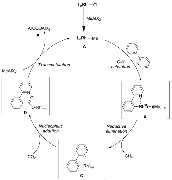 Proposed Rh-catalyzed carboxylation reaction mechanism. Reprinted (adapted) with permission from [91].