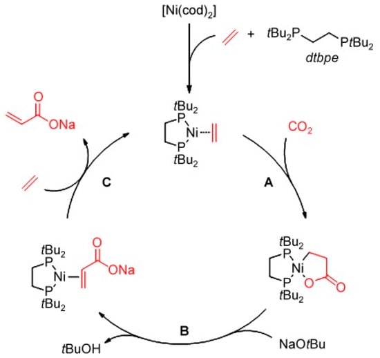 It has been an unsolved problem and the most attractive reaction in catalysis research for more than thirty years to catalyze the synthesis of acrylates from the cheap and abundant building block of C1 carbon dioxide and alkenes. The synthesis of acrylic acids via the carboxylation of CO2 and alkene was first achieved by Hoberg and Minato [94]. Limbach et al. reported the CO2 coupling reaction with ethylene to acrylates by means of cyclometalation, followed by the elimination of beta-hydride [95]. The proposed catalytic cycle for the formation of Na acrylate from ethylene and CO2 is shown in Scheme 13. A crucial step in the nickel-mediated acrylate synthesis from CO2 and ethylene was the formation of nickelalatones. The reaction was meticulously demonstrated in three distinct stages: (1) the formation of nickelalactone at room temperature using a Ni(dtbpe) (dtbpe = di-tert-butylphosphino ethane) ligand that reacts with C2H4 and CO2 with pressure of 2 bar and 6 bar subsequently in THF; (2) the utilization of potent base alkoxides in PhCl to effectively break the nickelalactone ring, which is challenging task, resulting in the formation of π -complexes featuring 2-coordinated acrylate; (3) the exchanging of ligands with ethylene resulting in the release of Ni(dtbpe)(CH2CH2) and an acrylate product under room temperature. A catalytic turnover of more than 10 was attained once the catalytic cycle was put together. A simple aqueous extraction was used to separate the Na acrylate formed during the reaction. Extensive studies have been conducted by Hoffman et al. on the carboxylation of ethylene to acrylates using CO2 mediated with nickel [96]. The main challenge encountered is the breakdown of the nickelalactone structure. They developed a new approach to producing lactones. However, all the existing methods for synthesizing acrylic acid complexes require too much activation energy and cannot function at normal temperatures.
