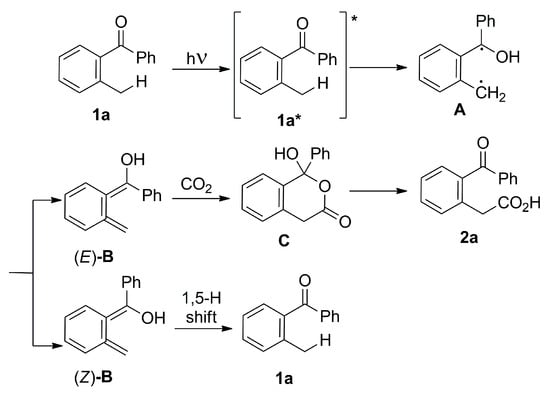 Carboxylation, which involves transforming sp3-hybridized C–H bonds with CO2, can be a challenging process. Despite that, in comparison to carboxylating C–halogen bonds, carboxylating C–H bonds directly through C–H bond activation is a more efficient and environmentally friendly approach [86]. The first study on the direct carboxylation of benzylic sp3 C–H bonds was published by Murakami and coworkers utilizing o-Alkyl phenyl ketones directing groups that can be activated via UV light [100]. According to the proposed mechanism, through photoenolization, endergonic isomerization occurs under photoirradiation to generate the highly energetic o-quinodimethanes. The intermediate, which is highly energetic, goes through a [4+2] cycloaddition reaction with CO2 under a light to form a six-membered cycloadduct. This is then followed by a ring-opening process that ultimately produces the desired acid product (Scheme 15).
