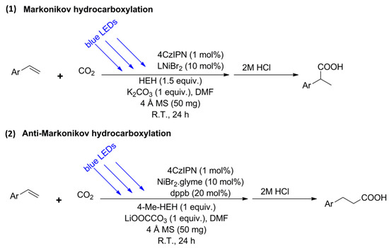 Styrene derivatives for Markovnikov and anti-Markovnikov hydrocarboxylation with CO2 [104].