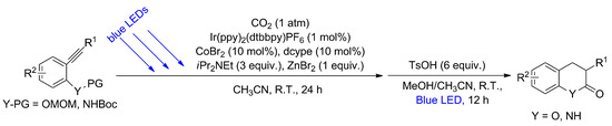 - Hou, J.; Ee, A.; Feng, W.; Xu, J.-H.; Zhao, Y.; Wu, J. Visible-Light-Driven Alkyne Hydro-/Carbocarboxylation Using CO2 via Iridium/Cobalt Dual Catalysis for Divergent Heterocycle Synthesis. J. Am. Chem. Soc. 2018, 140, 5257–5263. [Google Scholar] [CrossRef] [PubMed]