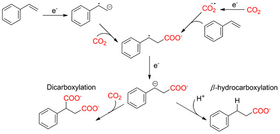 A direct β-selective hydrocarboxylation of styrenes was demonstrated by Jamison and their coworkers in continuous flow reactors using 1,2,2,6,6-pentamethylpiperidine (PMP) as the tertiary amine reductant and p-terphenyl (20 mol.%, absorption λmax = 283 nm) as the photoredox catalyst under atmospheric CO2 pressure [105]. CO2 was reduced to radical anion under UV light via the reducing agent and catalyst. It is important to highlight that this chemical reaction is capable of handling both α-substituted and β-substituted styrenes, resulting in the highly selective production of β-carboxylated products with a moderate to good yield.