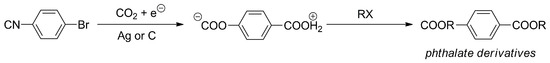 - Reche, I.; Mena, S.; Gallardo, I.; Guirado, G. Electrocarboxylation of Halobenzonitriles: An Environmentally Friendly Synthesis of Phthalate Derivatives. Electrochim. Acta 2019, 320, 134576. [Google Scholar] [CrossRef]