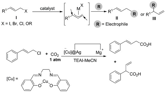 The same group also developed the photo-catalytic carboxylation process that involves an allylic C–H bond of basic alkenes [101]. The process is catalyzed by a ketone and a copper complex and was performed under a high temperature (110 °C) and UV irradiation in 2016. In this method, to achieve the unique carboxylation reaction, ketones are photo-reacted with alkenes in an endergonic manner, forming homoallyl alcohol intermediates in the process. Then, the alcohol is first deprotonated via copper to butoxide. Afterwards, the desired product is obtained through beta-carbon cleavage. The fundamental process comprises two phases: (1) the formation of highly energetic intermediates in an endergonic photoreaction, and thereafter, (2) the formation of CO2 through the carboxylation reaction is made possible via the copper-catalyzed allyl transfer process that necessitates the cleavage of a C–C bond from homoallylic alcohols.