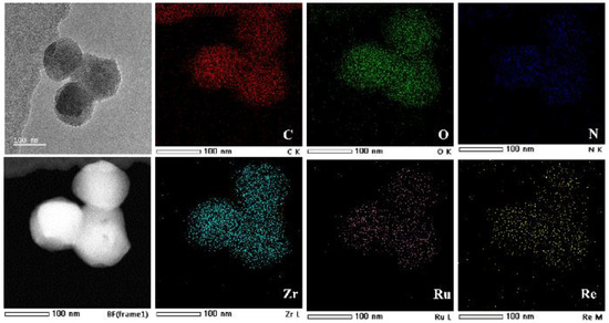 The structures of as-synthesized Re-Ru@U, Re@U, Ru@U and UiO-66 are characterized by powder X-ray diffraction (PXRD) and FT-IR, as shown in Figure S1. The diffraction patterns of Re-Ru@U, Re@U and Ru@U match well with the peaks of pristine UiO-66 [26], indicating their crystalline nature with the integration of metal complexes into scaffolds. In the IR spectra, the featured IR bands related to carbonyl asymmetric vibration at 2026, 1924 and 1910 cm−1 are observed for the Re-contained catalysts of Re@U and Re-Ru@U [27,28], indicating the incorporation of ReC2 into the UiO-66 matrix. The uniform dispersion of Re and Ru complexes inside the UiO-66 matrix without aggregation is verified by the representative aberration-corrected high-angle annular dark-field (HAADF) scanning transmission electron microscopy (STEM) images and the energy-dispersive X-ray (EDX) spectroscopy element mapping, as shown in Figure 1.