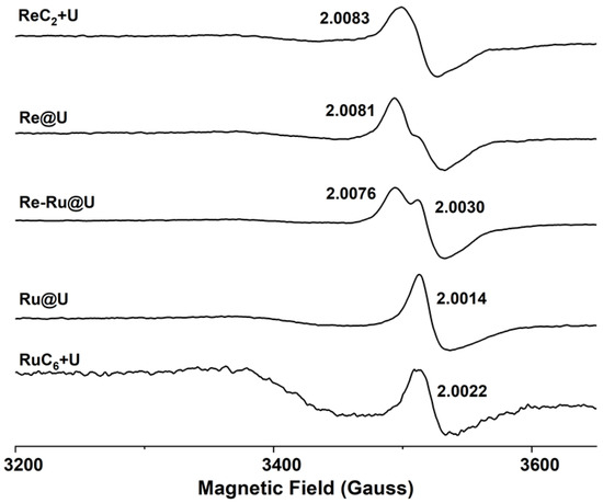 When comparing the homogeneous system with the heterogeneous systems, the additional introduction of the RuC6 photosensitizer to ReC2 (ReC2 + RuC6 + U) could not significantly improve the performance of ReC2, while the performance of co-assembling Re-Ru@U was greatly improved compared with that of Re@U. In order to disclose the activity disparity, the one-electron-reduced (OER) species is measured by electron paramagnetic resonance (EPR) spectra under visible-light irradiation in the presence of TEOA, as shown in Figure 4. Both the heterogenous Re@U and the homogenous ReC2 with UiO-66 show an EPR signal with a g value of ~2.008; similarly, the Ru@U and the RuC6 with UiO-66 give a signal with a g value of ~2.002. According to previous reports, these two signals are, respectively, ascribed to ligand-centred radical anions of [(bpy)Re(CO)3Cl]•− and radical ion complexes of RuII, whose small deviation from free spin (g = 2.003) arises from a small amount of unpaired spin density on the metal atoms [39,40]. As for the co-assembly of Re-Ru@U, the simultaneous appearance of two signals with g values of 2.0076 and 2.003 indicates the co-existence of dual ligand-centred radical species without interference with each other; that is, Re and Ru centres could be separately one-electron reduced during irradiation in the presence of an electron sacrificial reagent. This result is consistent with the above deduction that ReC2 centres bear double functions in the Re-Ru@U catalyst to harvest light and catalyse conversion.