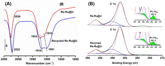 This presumption is evidenced by the comparison of recycled Re-Ru@U with pristine Re-Ru@U. In the IR spectra (Figure 5A), the three featured IR peaks retained in the recycled sample experienced several wavenumber shifts to a lower-energy direction. In view of the sensitivity of carbonyl IR bands to electron density in the central rhenium atom [15,42,43,44], these shifts suggest an increase in electron densities on Re centres partly. In XPS results, the BE of Ru 3d5/2 (overlapping with C 1s) underwent a 0.3 eV shift from 281.2 to 281.5 eV after reaction (Figure 5B), indicating a decrease in electron density at Ru centres. Therefore, electron transfer occurs from Ru to Re centres during the photocatalytic process, although the tiny change in electron density on Re centres is only monitored by IR and not XPS.