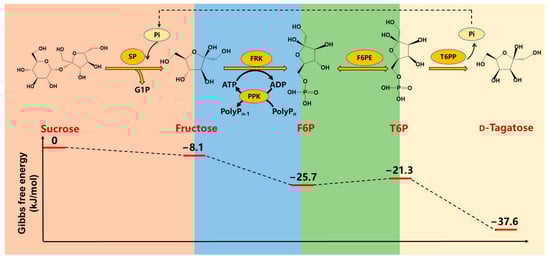The change in Gibbs free energy is used to reflect the stability of a reaction system in thermodynamics, and a lower Gibbs free energy usually leads to a more stable system [27]. Here, to identify the thermodynamic feasibility of the MCTS route, the standard Gibbs free energy change (ΔG′0) was calculated (https://equilibrator.weizmann.ac.il/ (accessed on 15 September 2023)). As shown in Figure 1, the overall ΔG′0 of MCTS (from sucrose to d-tagatose) was −37.6 kJ·mol−1, indicating the thermodynamic favorableness of the MCTS route.