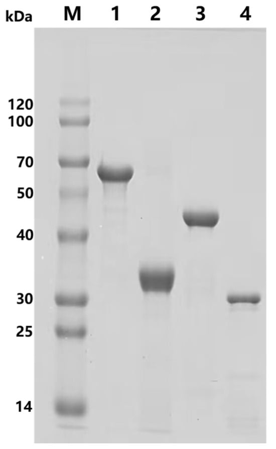 SDS-PAGE analysis of purified enzymes in the MCTS route. M, protein marker; line 1, BaSP; line 2, CaFRK; line 3, CaF6PE; line 4, MmT6PP.