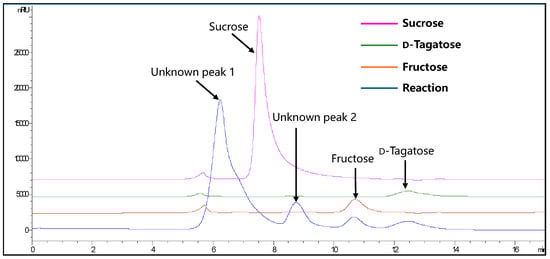 Subsequently, a 1 mL reaction mixture comprising the above four enzymes was prepared, and the products were determined by high performance liquid chromatography (HPLC). As shown in Figure 3, the HPLC result for the reaction mixture showed a peak at a retention time of 12.5 min (consistent with the d-tagatose standard), suggesting the feasibility of d-tagatose synthesis from sucrose. In addition, no sucrose peak in the reaction mixture was observed, indicating the high efficiency of BaSP. However, some other peaks (e.g., unknown peak 1, unknown peak 2, and d-fructose) were detected, indicating that some intermediate products (e.g., d-fructose, F6P, and T6P) were not sufficiently converted to the final product d-tagatose. To improve the catalytic efficiency of the MCTS route and reduce the cost, the following strategies and optimization were proposed.