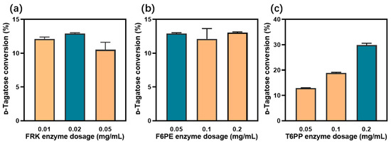 In general, in a multienzyme cascade route, all enzymes exert synergistic performance at a certain dosage ratio. Here, multienzyme dosages in the MCTS route were optimized, and the initial dosage of each enzyme was determined through their activities and performance in the MCTS route. First, a small amount of BaSP and CaFRK (0.01 mg·mL−1) were used in the MCTS route due to its relatively high activity (Table 1). Then, 0.05 mg·mL−1 (CaF6PE and MmT6PP) and 0.04 mg·mL−1 (DrPPK) were selected as the initial dosages. Based on the initial condition, the dosages of three cascade enzymes (CaFRK, CaF6PE, and MmT6PP) were optimized. As shown in Figure 5a,b, different dosages of CaFRK and CaF6PE had insignificant effects on d-tagatose conversion. Here, 0.02 mg·mL-1 CaFRK and 0.05 mg·mL−1 CaF6PE were selected due to their relatively higher d-tagatose conversions compared with those at other concentrations. As shown in Figure 5c, d-tagatose conversion considerably increased with the increasing dosage of MmT6PP, indicating the rate-limiting role of MmT6PP. Here, 0.2 mg·mL−1 MmT6PP was selected due to its good performance in terms of d-tagatose conversion (29.9%).