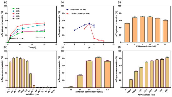 Optimization of reaction conditions for the synthesis of d-tagatose catalyzed by a multienzyme cascade. (a) Temperature; (b) pH; (c) different PBS concentrations with the fixed concentration of Tris-HCl buffer (50 mM); (d) metal ion, Mix1: Mg2+ (2 mM) + Mn2+ (2 mM), Mix2: Mg2+ (2 mM) + Co2+ (2 mM), Mix3: Mn2+ (2 mM) + Co2+ (2 mM); (e) metal ion concentration; (f) ADP:sucrose ratio. The error bar represents the standard deviation of triplicate measurements. A 1 mL reaction mixture contained 10 mM sucrose, 0.01 mg·mL−1 BaSP, 0.02 mg·mL−1 CaFRK, 0.05 mg·mL−1 CaF6PE, 0.2 mg·mL−1 MmT6PP, and 0.04 mg·mL−1 DrPPK.
