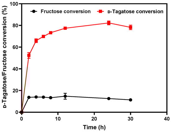 A time course was investigated to evaluate the trend of produced d-tagatose and the intermediate product (d-fructose) as the reaction time (Figure 7). The d-tagatose conversion dramatically increased to 52% in the first two hours, then slowly increased to 82.3% at 24 h. However, there was approximately 13% unutilized d-fructose in the mixture. As shown in Figure S2, in addition to d-fructose, other intermediate products (e.g., F6P) were also detected in the reaction mixture, suggesting that the cascade enzymes (e.g., CaFRK, and CaF6PE) need to be further improved in our future work.