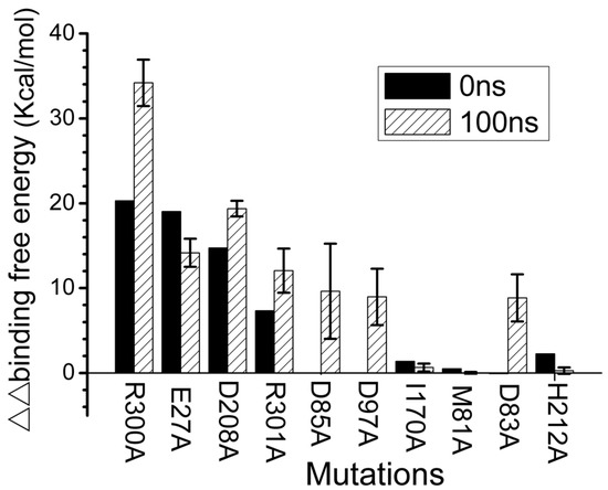 - Massova, I.; Kollman, P.A. Computational Alanine Scanning To Probe Protein−Protein Interactions: A Novel Approach To Evaluate Binding Free Energies. J. Am. Chem. Soc. 1999, 121, 8133–8143. [Google Scholar] [CrossRef]
