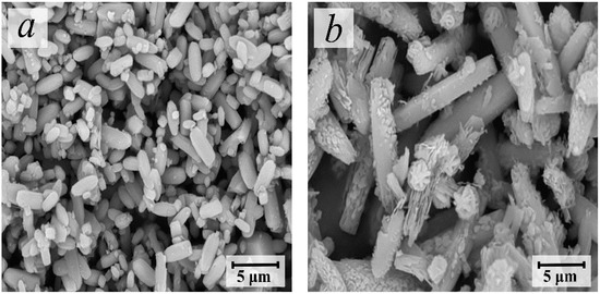 According to the SEM data, the crystallites of the Al-ZSM-12 zeolite (Figure 3a) are smaller (5–6 µm) compared to the TiO2/Al-ZSM-12 zeolite [15]. This is due to the higher Al content in the sample, which affects the rate of nucleation and agglomeration of the particles [35].