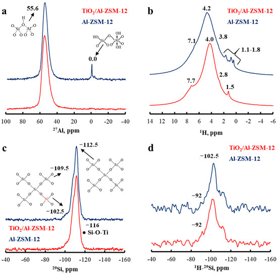 The 1H NMR spectra (Figure 5b) contain isolated Si–OH groups located on the outer surface of the zeolite (1.1–1.8 ppm); internal Al–OH groups (2.8 ppm); fragments of Si–O(H)–Al forming Brønsted acid sites (3.8, 4.0 and 4.2 ppm); hydroxyls associated with Si–OH…O– hydrogen bonds (7.1 and 7.7 ppm). A similar shift for the TiO2/Al-ZSM-12 sample at 4 ppm indicates a lower concentration of Brønsted acid sites [50].