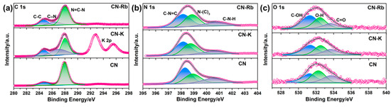To investigate the variations in PCN’s chemical states, an XPS analysis was conducted. The XPS survey spectra of CN-M showed that C, N, O, and M were present (Figure S4a). Additionally, the high-resolution C 1s, N 1s, and O 1s XPS spectra of the PCNs revealed that they have similar peak shapes (Figure 2 and Figure S4). The two typical peaks for C 1s at 288.2 and 284.8 eV were respectively ascribed to N–C=N and C–C [30]. A new peak that was assigned to CN at 286.5 eV may also be seen in the C 1s spectra of CN-M when compared to C≡N. N–(C)3 bridging N atoms, sp2-bonded N atoms within triazine rings (C–N=C), and C–N–H, are respectively indexed to the three typical peaks in N 1s spectra (Figure 2b and Figure S4c) at 399.1, 398.6, and 400.7 eV [31]. The high-resolution O 1s spectra of CN and CN-M have been shown in Figure 2c and Figure S4d. The spectra of CN and CN-M show three peaks at 531.1, 532.4, and 533.3 eV, attributed to C–O–H and O–H of the water absorbed and C=O, respectively [32,33]. In addition, chloride ion content is negligible in CN-M (as shown in Table S2). Meanwhile, the mole percentage of M has also been listed in Table S2, indicating that M ions are successfully introduced into the CN-M structure.