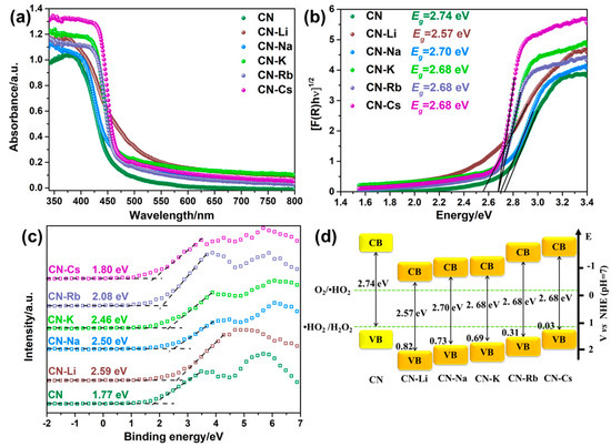 (a) DRS spectra of CN and CN-M. (b) The Kubelka–Munk plots of CN and CN-M. (c) XPS valence band spectra. (d) Electronic energy band positions of CN and CN-M.