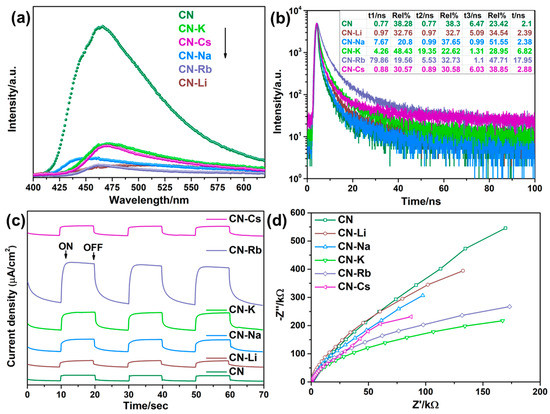 To examine the charge recombination behavior, the steady-state and time-resolved PL spectroscopies of CN and CN-M were put to the test. Because of the synergistic interaction between the improved transport of electrons between the PCN layers caused by the M bridges and the strong electron-withdrawing capability of the cyano group, as shown in Figure 4a, the CN-M specimens demonstrate substantially less PL emission than CN, suggesting lower charge recombination. In addition, time-resolved transient PL spectroscopy was used to examine the average charge-carrier lifetime and the behaviors of charge-carrier separation. The decay curves were fitted by using the triexponential function. The average charge-carrier lifespan rose from 2.10 ns for CN to 17.95 ns for CN-Rb, as shown in Figure 4b and Table S1, demonstrating that more photogenerated carriers can transfer to its surface to be involved in the reactions occurring on the surface. Additionally, different degrees of advancement had been made in the typical charge-carrier lifetimes of CN-Li, CN-Na, CN-K, and CN-Cs.