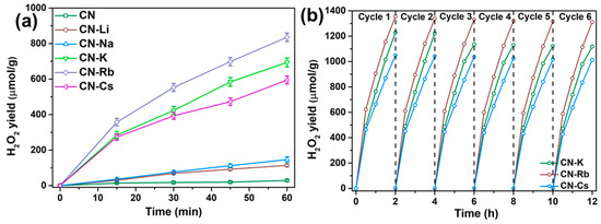 The acquired samples’ photocatalytic activity for the generation of H2O2 was assessed under white LED light. All of the samples display H2O2 production performances following 60 min of irradiation, as shown in Figure 5a. In particular, the amount of H2O2 produced by CN was much lower than that of CN-M samples, at just 59.20 μmol/g. The H2O2 production by CN-M increased with an increasing metallic character from Li to Rb. It then decreased for CN-Cs. Therefore, in comparison to CN, 14.11 times more H2O2 (835.51 μmol/g) was generated by CN-Rb. Additionally, under visible light (λ > 420 nm), the time-dependent variation in the H2O2 generation rates of CN and CN-M was evaluated. Figure S9 demonstrates that with CN-M, sustained H2O2 production is seen within 12 h without degradation. The H2O2 yield of CN-Rb is 12.52 mmol/g after 12 h of exposure, which is 156.04 times greater than that of CN (80.21 μmol/g). In addition, after 12 h of irradiation, the H2O2 yields of CN-K and CN-Cs are 9.10 and 8.54 mmol/g, respectively, indicating that CN-K, CN-Rb, and CN-Cs have outstanding long-term stability. The reaction solution’s dissolved oxygen content (DO) was measured at 1 atm, ~9.82 mg/L, and 283.15 K. The yield of H2O2 in a 200 mL solution should be 61.37 μmol if all oxygen is converted to H2O2. The H2O2 yields of CN-Rb, CN-K, and CN-Cs in our experiment exceeded the theoretical value by 82.60, 65.96, and 66.77 μmol, respectively, at 1 h. H2O2 output grew steadily throughout the reaction, showing that O2 from the air supplemented the O2 in the reaction’s solution. This is likely because CN-Rb, CN-K, and CN-Cs have strong O2 adsorption capabilities. The performance stabilities of CN-Rb, CN-K, and CN-Cs were assessed by a cycling 0.03 g specimen that was washed following centrifugation from the reacted solution (Figure 5b). As a result of the increased reaction time, the H2O2 yield did not demonstrate any substantial reduction, suggesting outstanding stability for photocatalytic H2O2 production.