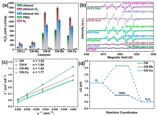 Additionally, the electron transfer number (n) and kinetic current density (JK) in the ORR routes on the PCN samples were assessed through LSV in accordance with the Koutecky–Levich equation to further demonstrate that the reaction followed the 2e−-ORR pathway. The current densities of CN-K, CN-Rb, and CN-Cs were much higher than those of CN, as shown in Figure 7c and Figure S15, showing that they had better oxygen-reduction activities than CN. Moreover, the values of n were 1.22, 1.89, 1.82, and 1.77 for CN, CN-K, CN-Rb, and CN-Cs, respectively, indicating that two-step single-electron ORR occurred on CN-K, CN-Rb, and CN-Cs.