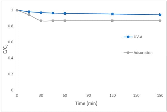 Before the study of amisulpride photocatalytic degradation, preliminary control experiments (adsorption and UV-A photolysis) were conducted in ultrapure water (UW), and the results are depicted in Figure 1. Adsorption experiments showed that the equilibrium succeeded at 30 min, and about 13% removal of amisulpride was observed. Photolysis under UV-A light resulted in a negligible decrease (~6.0%) of amisulpride and can be explained by the UV-Vis spectra of the pharmaceutical (Figure S1). Direct photolysis under UV-A light and the employed conditions was not expected since amisulpride does not absorb at 365 nm (maximum emission wavelength of the employed irradiation source), justifying the observed trend. Negligible photodegradation of the studied pharmaceutical under UV-A irradiation [13] and simulated solar irradiation [8] was also reported in previous studies.