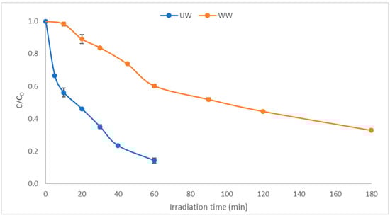 Photocatalytic degradation of amisulpride under UVA irradiation in UW and WW ([amisulpride]0 = 1 mg L−1; [g-C3N4] = 300 mg L−1).