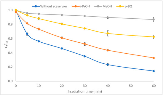 The contribution of HO•, h+,, and O2•− was evaluated using isopropanol (i-PrOH), methanol (MeOH), and p-benzoquinone (p-BQ), respectively. The scavengers were selected due to their high-rate constant reaction with the corresponding species. More specifically, i-PrOH is a well-documented HO• scavenger presenting a high-rate constant reaction with the radical equal to 1.9 × 109 L mol−1 s−1 [23,24]. MeOH can quench both HO• and h+ and react with HO• with a rate constant of 1 × 109 L mol−1 s−1 [20,25]. Para-benzoquinone (p-BQ) can quench O2•− with a rate constant of 1.9 × 109 L mol−1 s−1 [20]. The pseudo-first order rate constants as well as the degradation profile in the presence of scavengers are presented in Table 2 and Figure 3, respectively.