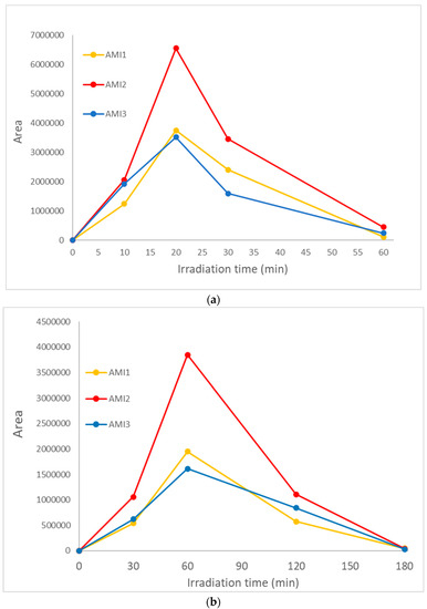 The formation of TPs was also followed during the photocatalytic treatment. As presented in Figure 5, the TPs in UW and WW attained their maximum area in 20 min and 60 min, respectively. Thereafter, the area of the three TPs in both matrices were readily reduced. Subsequently, the cleavage of the rings can take place, and low molecular weight TPs can be produced before complete mineralization. After prolonged application of heterogeneous photocatalysis, two low-molecular-weight carboxylic acids, i.e., formic and acetic acid, were identified.