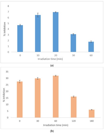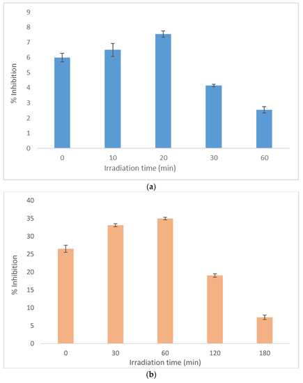 Evolution of toxicity during the photocatalytic process in: (a) UW; and (b) WW using Chlorococcum sp. ([amisulpride]0 = 1 mg L−1; [g-C3N4] = 300 mg L−1).