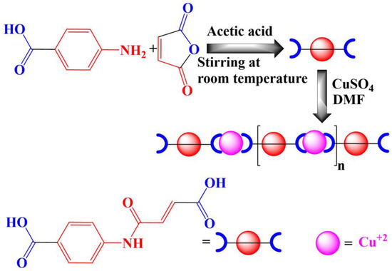 The 4ABA–MA was synthesized by mixing the solutions of 4ABA and MA with gentle stirring in an acidic medium at room temperature (24 °C) (Figure 1) [50]. The acidic medium and low-temperature conditions were used to avoid the cyclization by nitrogen atoms of an amino group. In the acidic condition, the possibility of electron donation from the nitrogen atom of the amino group to maleic anhydride is reduced. Still, the reaction occurs due to the high basicity of the amino group and less stability of maleic anhydride. Upon conversion of the closed ring of maleic anhydride to an open chain after reaction, the electronegativity of the nitrogen atom of the amide group decreases due to the electron withdrawing carbonyl group, which is directly attached to the nitrogen atom in the product (in the form of the amide). Therefore, the nitrogen of the amide group will not attack the carboxylic carbon atom to form a cyclic product in the acidic medium at a low temperature. Then the Cu(II)–[4ABA–MA] MOF was synthesized by the solvothermal process in DMF solvent at a pH of 6.7. Due to the acidic nature of carboxylic groups, deprotonation occurred, and carboxylic groups of 4ABA–MA were converted into carboxylate ions. The electron-donating capacity of 4ABA–MA towards the Cu(II) ions increases due to deprotonation, resulting in MOF formation.