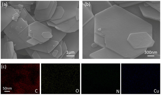 Furthermore, the morphology of the Cu(II)–[4ABA–MA] MOF was determined by SEM and elemental mapping analysis. The SEM images show the Cu(II)–[4ABA–MA] MOF exists in a 2D hexagonal shape with a smooth surface (Figure 3a,b). Two-dimensional morphology arises from the 2D complexation of 4ABA–MA. There are two carboxylic groups in the 4ABA–MA structure at 180° with respect to each other. Therefore, the 4ABA–MA shows complexation from both sides to form the Cu(II)–[4ABA–MA] MOF, forming a 2D hexagonal structure. Additionally, the elemental mapping analysis of the Cu(II)–[4ABA–MA] MOF was performed, which reveals the composition of the catalysts. Carbon, nitrogen, oxygen, and copper elements are found in the Cu(II)–[4ABA–MA] MOF.