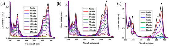 The photocatalytic performance of Cu(II)–[4ABA–MA] was investigated against MeBl via UV-visible spectrophotometry. The catalytic efficiency of Cu(II)–[4ABA–MA] was determined under different conditions, such as in the absence or presence of sunlight and with or without NaBH4 (reductant). Firstly, 0.1 g of Cu(II)–[4ABA–MA] was added to the 100 mL of (0.05 mM) MeBl solution in the absence of NaBH4 and light, and the solution run in a UV-visible spectrophotometer. The UV-visible spectra show a decline in the λmax value for the peak at 656 nm without additional peaks under different conditions (Figure 4a). This spectrum indicates that the Cu(II)–[4ABA–MA] has efficiently degraded the MeBl in 270 min. Similarly, the degradation of MeBl was also monitored in the presence of sunlight (Figure 4b). The peaks of MeBl decreased continuously, resulting in the form of degradation of MeBl. However, it is found that the degradation of MeBl is much faster in the presence of sunlight than in dark conditions. The MeBl is degraded in 120 min in the presence of sunlight compared to 270 min under dark conditions [51]. These results demonstrate the higher photocatalytic efficiency of the Cu(II)–[4ABA–MA].