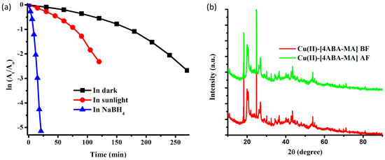 Photocatalytic performance of Cu(II)–[ABA–MA] MOF (a) Degradation kinetics under different conditions (the black line represents the absence of both sunlight and NaBH4 and the red line represents the presence of sunlight but the absence of NaBH4, while the blue line represents the presence of NaBH4 but the absence of sunlight). (b) XRD spectra of Cu(II)–[ABA–MA] MOF before (red color) and after (green color) photocatalytic degradation of MeBl.