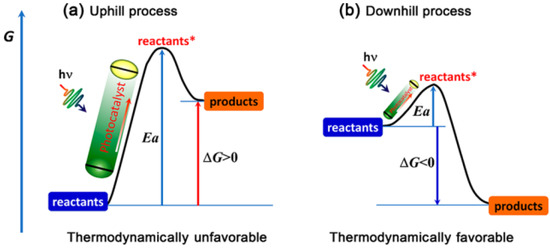 From the viewpoint of thermodynamics, chemical reactions are divided into uphill and downhill categories. The schematic of these reactions is illustrated in Figure 2 (the ‘*’ sign could represent the transition state). Uphill reactions that are powered by light could not be considered as photocatalysis [31]. Thermodynamically uphill reactions are nonspontaneous, and the use of a canonical catalyst could not initiate these reactions [31]. Usually, photocatalysis is considered as an appropriate terminology to describe a large number of spontaneous chemical reactions (downhill reactions) that are hindered by high activation energies. Thus, the introduction of light, as a source of energy, could enable these reactions [31,47]. Notably, there is another group of reactions that borrows the photocatalysis term. These reactions that use external potentials, usually, are referred to as photo-electrocatalytic/photo-electrochemical reactions [31]. Unlike photocatalysis, the photo-electrochemical water splitting is a thermodynamically uphill reaction [48,49,50]. Thus, during the process of photocatalytic water splitting, the energy of photons is converted to chemical energy (by using a photocatalytic material) [50].