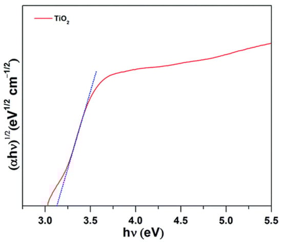 It is notable that the majority of basic absorption processes are allowed transitions (n = 2 or n = 1/2 for indirect and direct transitions, respectively) [84]. Finally, the graph of vs. is plotted, and the band gap energy is easily extrapolated by the interception of the linear region to the X-axis. Usually, different values of n (usually 1, and 1/2) are used to identify the correct type of transition. As an example, the Tauc plot of TiO2 is shown in Figure 3 [85]. Noteworthy, the straight blue line has been plotted to estimate Eg.
