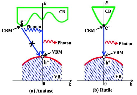 - Zhang, J.; Zhou, P.; Liu, J.; Yu, J. New understanding of the difference of photocatalytic activity among anatase, rutile and brookite TiO2. Phys. Chem. Chem. Phys. 2014, 16, 20382–20386. [Google Scholar] [CrossRef] [PubMed]