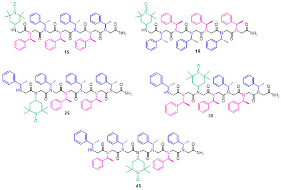 The library of catalytic foldamers was designed using benzylamine (pm), TEMPO, (S)- or (R)-1-phenylethylamine (spe o rpe, respectively) as submonomer synthons of the peptoid scaffolds (Figure 3). The synthesis of linear peptoids was accomplished by the “sub-monomer” solid-phase approach on a Rink amide resin. The iteration of bromoacetylations and amine displacement steps gave the desired peptoid oligomers (Scheme 1). In Table 1, all the catalysts synthesized in that paper are reported.