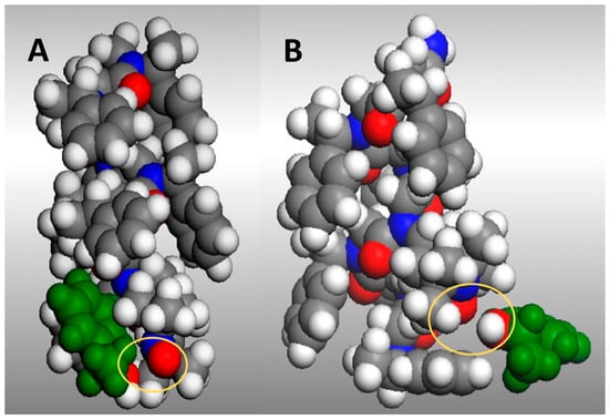 (A) Model of energy-minimized structure of the catalytic peptoid 1S with substrate 1-phenylethanol. (B) Model of energy-minimized structure of the catalytic peptoid 4S with substrate 1-phenylethanol. Colors: hydrogen, white; oxygen, red; nitrogen, blue; 1-phenylethanol (substrate), green. Adapted with permission from [30].