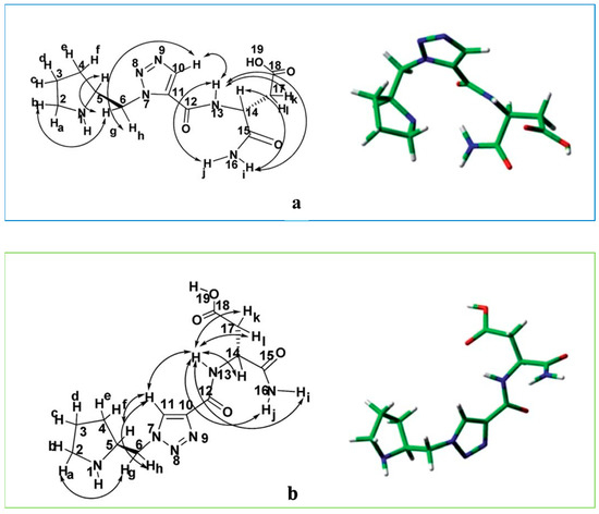 Prior to the examination of the catalytic efficiency of 68 and 68a, an extensive structural study was performed to understand the hydrogen-bonding properties and turn pattern. The NMR investigations in combination with ROE-restrained molecular dynamics revealed that catalyst 68 (1,5-triazole catalyst) adopts a turn-like compact structure (Figure 8a), while the 1,4-disubstituted isomer, catalyst 68a is characterized by an extended conformation (Figure 8b).