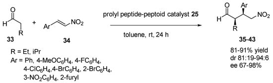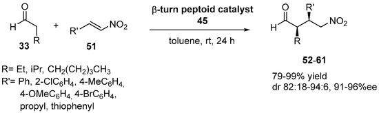 The ability of peptoid-based catalysts summarized in Figure 7 has been tested for the asymmetric Michael addition between aldehydes and nitro-olefins resulting in γ-nitro aldehydes, which are important building blocks leading to γ-aminoacids [45,46,47,48]. The catalytic performances of peptoids 44–48 were initially tested in the reaction between β-nitrostyrene and pentanal (Table 5).