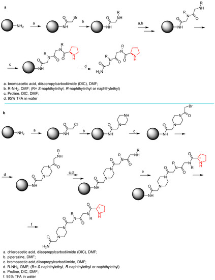 The sequences of five designed tripeptoids (44–48) consist of an S- or R-pyrrolidine group at the N-terminus and two consecutive S-, R- or achiral naphthyl-ethyl side chains. The structure of 44 bears an S-pyrrolidine group at the N-terminal and two chiral R-naphthylethyl side chains (Nr1npe). The structures of peptoids 45–48 were designed having a piperazine group at the C-terminus to enhance their water solubility. The synthesis of linear peptoids was accomplished by the “sub-monomer” solid-phase approach on Rink amide resin. The preparation of 44 required a bromoacetylation step followed by an amine displacement step. Bromoacetylation and amine displacement steps were repeated until the desired peptoid was obtained (Scheme 3a). For peptoids 45–48, the synthetic procedure was extended by the initial insertion of the piperazine moiety, achieved by a chloroacylation followed by a cyclic diamine displacement. Once desired sequences have been obtained, the peptoids were cleaved from the resin and characterized (Scheme 3b).