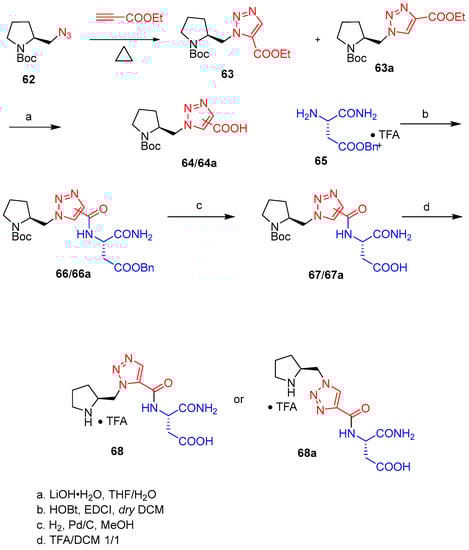 Scheme 5 reports the synthetic route towards new catalysts. The preparation of target molecules was accomplished by exposing the known azidopyrrolidine (62) to a thermal Huisgen [3 + 2] cycloaddition with ethyl propiolate to provide two, chromatographically separable, isomeric triazoles, 63 and 63a, in a 28:72 ratio. Both regioisomers (1,5- and 1,4-disubstituted triazoles) were independently transformed to the corresponding acid 64 or 64a. The following coupling with isoaspargine 65 under N-(3-dimethylaminopropyl)–N-ethyl-carbodiimide hydrochloride (EDCI) and hydroxybenzotriazole (HOBt) conditions furnished pyrrolidine-triazole 66 or 66a. Hydrogenation of benzyl ester to 67 or 67a with subsequent TFA-mediated deprotection furnished 68 or 68a.