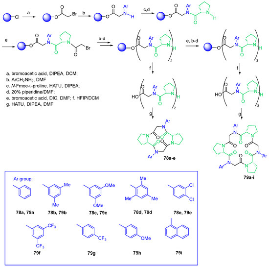 - Webster, A.M.; Cobb, S.L. Recent Advances in the Synthesis of Peptoid Macrocycles. Chem. Eur. J. 2018, 24, 7560–7573. [Google Scholar] [CrossRef]