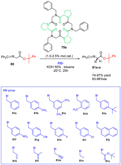 - Schettini, R.; De Riccardis, F.; Della Sala, G.; Izzo, I. Enantioselective Alkylation of Amino Acid Derivatives Promoted by Cyclic Peptoids under Phase-Transfer Conditions. J. Org. Chem. 2016, 81, 2494–2505. [Google Scholar] [CrossRef]