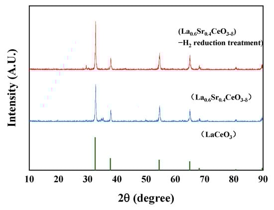 | Elements | Standard Atomic Ratio | Atomic Ratio of the Fresh La0.6Sr0.4CeO3-δ | Atomic Ratio of the La0.6Sr0.4CeO3-δ Reduced by H2 |