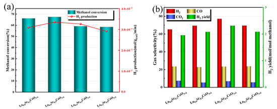 - The experimental results showed that La0.6Sr0.4CeO3-δ has the highest methanol conversion and hydrogen production per unit time among the La1-xSrxCeO3-δ. In addition, excessive Sr content led to a decrease in H2 selectivity and H2 yield.