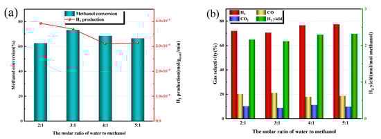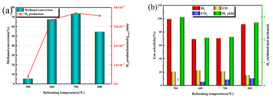 - The influence of experimental conditions on the catalytic performance of La0.6Sr0.4CeO3-δ catalyst was investigated in this study, and the optimal reforming temperature, W/M and LHSV were determined to be 700 °C, 3:1 and 20 h−1, respectively. The maximum methanol conversion rate was 82%, and the hydrogen production per unit time could reach 3.2 × 10−3 mol/g(cat)/min. La0.6Sr0.4CeO3-δ is a potential catalyst for methanol steam reforming with good catalytic performance. The potential of methanol to hydrogen depends on the catalyst with high selectivity for hydrogen at low temperatures. Therefore, the steam reforming of methane over the Sr-doped LaCeO3-δ catalyst shows good promise for the development of an efficient, economical and clean hydrogen production system.